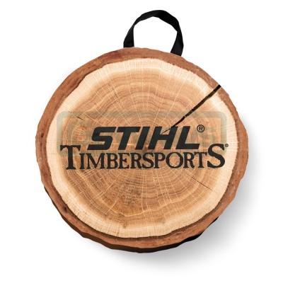 Motivo de discos de madeira na parte dianteira, material de enchimento de espuma, diâmetro de 34 cm, com fecho de velcro e alça para pendurar. 070719