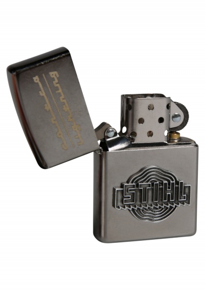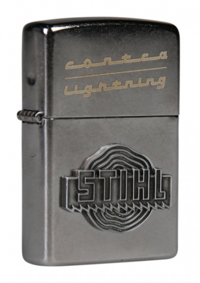 Cor prateada, marca Zippo, com a descrição "CONTRA LIGHTNING" e o emblema da STIHL. 070719