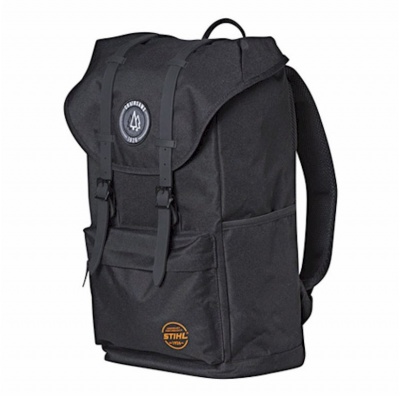 Cor Preta, 100% poliéster, tamanho aprox. 50 x 28 x 15 cm, 20 litros, forro impresso, grande compartimento principal, bolsa frontal, bolsa lateral, compartimento acolchoado para Notebook, alças acolchoadas, resistente à água, emblema "CHAINSAWS". 070719