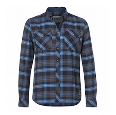 Cor azul em xadrez, 74% algodão, 26% poliéster, dois bolsos com botões, colarinho com botões. S - XXL. 070719