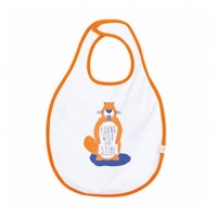 Cor branco, 95% algodão, 5% elastano, babete de capa dupla com borda em laranja, fecho de velcro, impressão frontal com desenho de castor. 130319