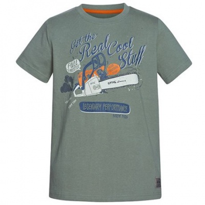 T-Shirt kids. Cor Verde escura, 100% algodão, com impressão dianteira "GET THE REAL COOL STUFF - LEGENDARY PERFORMANCE" com ilustração motosserra.Tamanho 98 - 140. 130319