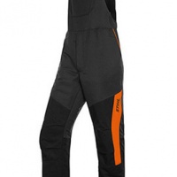 Protecção anti-corte classe 1 (= > 20 m/s). Material de respiração activa com elevado conforto, cor antracite, preto e laranja de advertência. Com proteção anti-corte, liberdade de movimento na parte traseira e passo, proteção dos rins, proteção contra espinhos tanto na parte frontal como traseira das pernas. Material de ventilação na parte posterior da coxa. Certificação KWF em trâmite. EN 381. Tamanhos desde S ao 3XL.